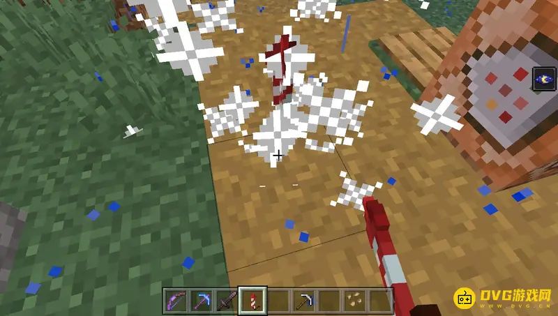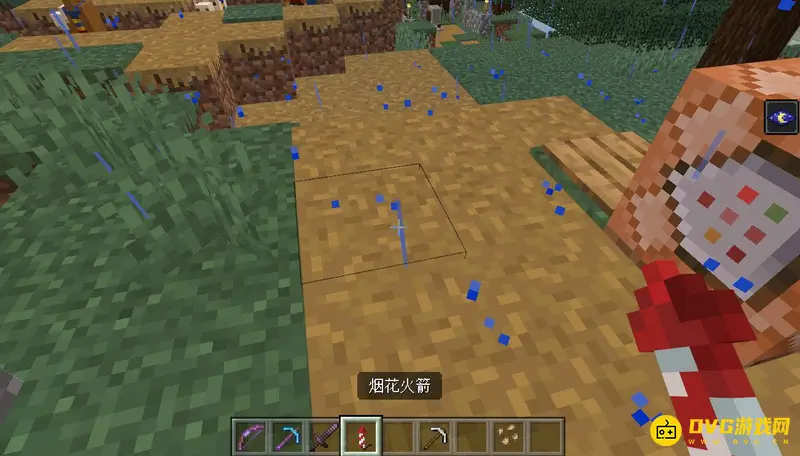 1,首先我们可以合成获得烟花火箭,然后我们手上拿着烟花火箭右键点击地面。