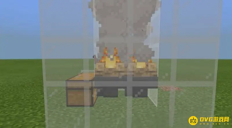 7.在地面放置一个大箱子,在通道中放上漏斗,漏斗的上面放上营火。注意漏斗的方向都要对着箱子,即可完成制造。