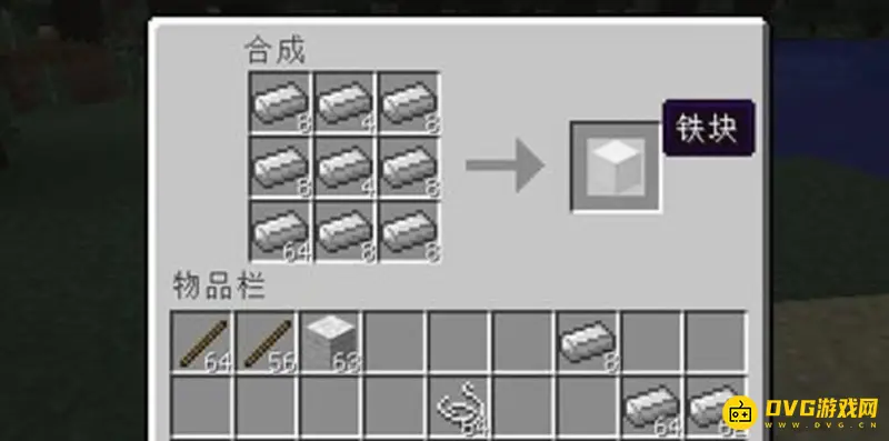 2、当玩家收集齐9个铁锭后,将铁锭放入工具箱进行合成就可以制作出铁块了。