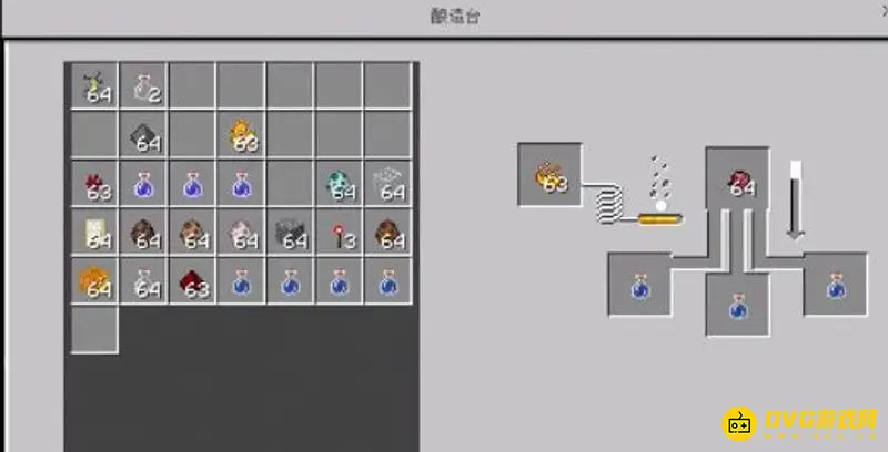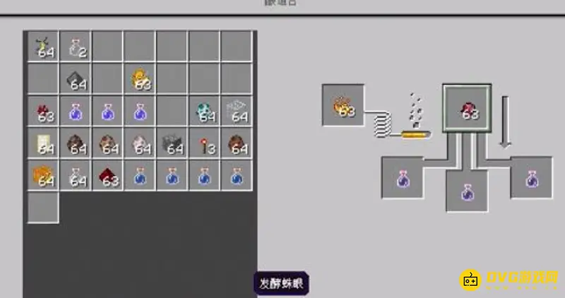 1、在酿造台中放入烈焰粉、发酵蛛眼以及3瓶水瓶。