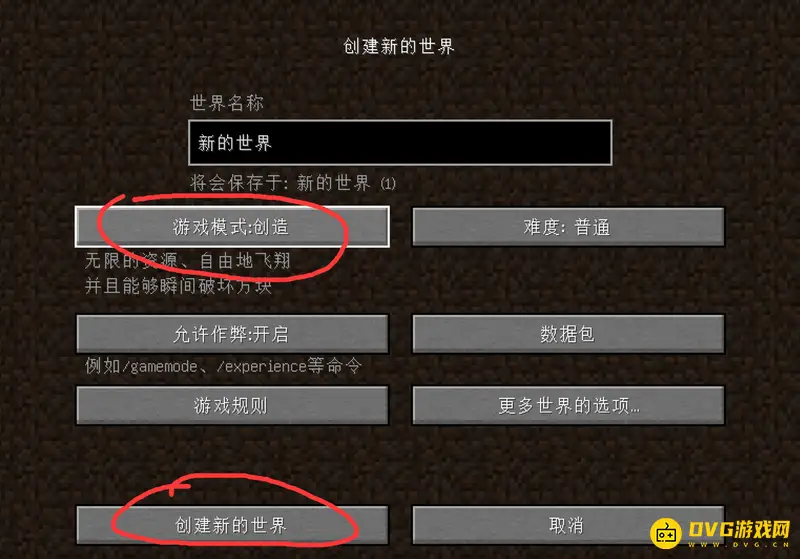 3、将游戏模式改为创造,然后点击创建新的世界。