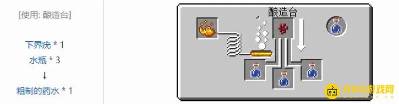1,首先我们需要找到酿造台,然后按照如图所示在上方放置下界疣,下方放置三个水瓶,酿造成粗制的药水。
