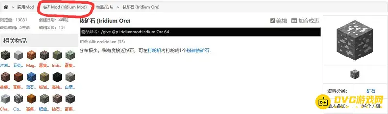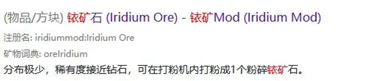 2,然后就可以在界面上方发现,该物品是铱矿MOD的内容,玩家安装这个MOD就可以获得铱矿了。