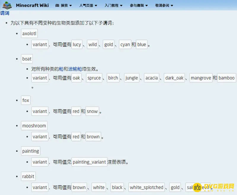 添加子谓词:对所有种类的船和运输船均生效。variant,可用值有oak、spruce、birch、jungle、acacia、dark_oak、mangrove和bamboo。