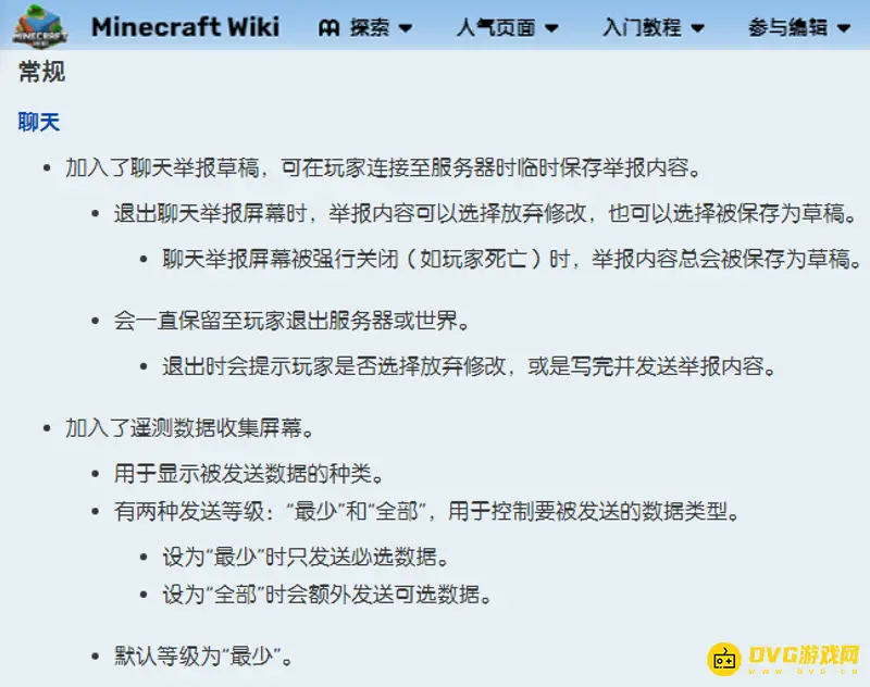 加入了聊天举报草稿,可在玩家连接至服务器时临时保存举报内容。退出聊天举报屏幕时,举报内容可以选择放弃修改,也可以选择被保存为草稿。聊天举报屏幕被强行关闭(如玩家死亡)时,举报内容总会被保存为草稿。会一直保留至玩家退出服务器或世界。退出时会提示玩家是否选择放弃修改,或是写完并发送举报内容。加入了遥测数据收集屏幕。用于显示被发送数据的种类。有两种发送等级:“最少”和“全部”,用于控制要被发送的数据类型。设为“最少”时只发送必选数据。设为“全部”时会额外发送可选数据。默认等级为“最少”。
