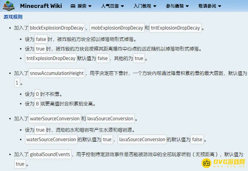 游戏规则中加入了blockExplosionDropDecay、mobExplosionDropDecay和tntExplosionDropDecay。