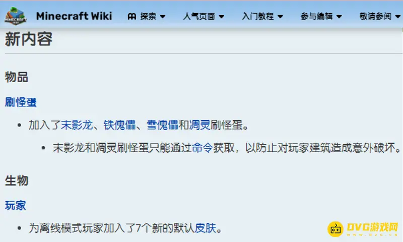增加了物品:末影龙、铁傀儡、雪傀儡和凋灵刷怪蛋。其中末影龙和凋灵刷怪蛋只能通过命令获取,以防止对玩家建筑造成意外破坏。为离线模式玩家加入了7个新的默认皮肤。