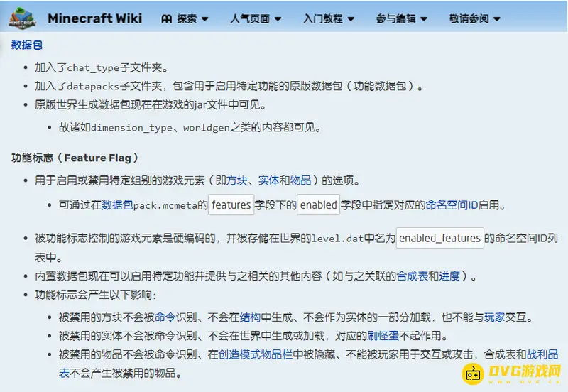 新增功能标志,用于启用或禁用特定组别的游戏元素(即方块、实体和物品)的选项。可通过在数据包pack.mcmeta的features字段下的enabled字段中指定对应的命名空间ID启用。被功能标志控制的游戏元素是硬编码的,并被存储在世界的level.dat中名为enabled_features的命名空间ID列表中。内置数据包现在可以启用特定功能并提供与之相关的其他内容(如与之关联的合成表和进度)。功能标志会产生以下影响:被禁用的方块不会被命令识别、不会在结构中生成、不会作为实体的一部分加载,也不能与玩家交互。被禁用的实体不会被命令识别、不会在世界中生成或加载,对应的刷怪蛋不起作用。被禁用的物品不会被命令识别、在创造模式物品栏中被隐藏、不能被玩家用于交互或攻击,合成表和战利品表不会产生被禁用的物品。