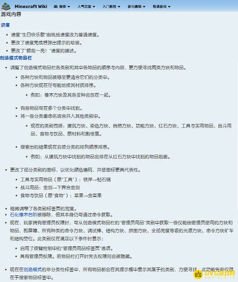 调整了创造模式物品栏各类别和其中各物品的顺序与内容,更方便寻找同类方块和物品。各种方块和物品被移至更适合它们的分类中。各种方块现在尽可能地按其材质排序。例如:橡木方块及其各变种会放在一起。有些物品可在多个分类中找到。将一些分类重命名或合并入其他类别中。