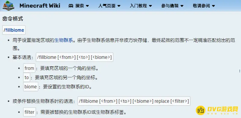 新增了命令格式/fillbiome,用于设置指定区域的生物群系。由于生物群系信息并非按方块存储,最终起效的范围不一定精准匹配给出的范围。基本语法:/fillbiome [] [] []from:要填充区域的一个角的坐标。to:要填充区域的另一个角的坐标。biome:要设置的生物群系的ID。按条件替换生物群系时的语法:/fillbiome [] [] [] replace []filter:需要被替换的生物群系ID或生物群系标签。