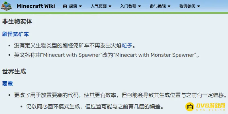 刷怪笼矿车:没有定义生物类型的刷怪笼矿车不再发出火焰粒子。英文名称由“Minecart with Spawner”改为“Minecart with Monster Spawner”。