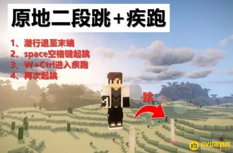 2.原地二段跳 疾跑:先潜行退至方块末端,然后点击跳跃,在空中的时候,迅速按下“W Ctrl”,落地瞬间再次跳起,会进入疾跑跳跃。