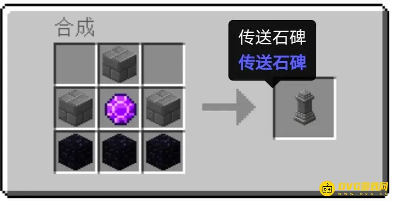 石砖 * 3 传送石 * 1 黑曜石 * 3=传送石碑 * 1。默认会在村庄内自动生成,右击激活后会使用随机的名称。(在放置传送石碑后取消命名,再进行激活之后也会使用随机名称)。
