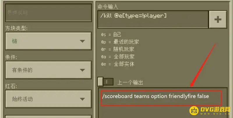 在我的世界单人模式中按T打开聊天框输入:/scoreboard teams option friendlyfire false,即可关闭队友伤害,如图所示,还有很多的指令是可以使用的,并且是有条件的,方块类型是链。