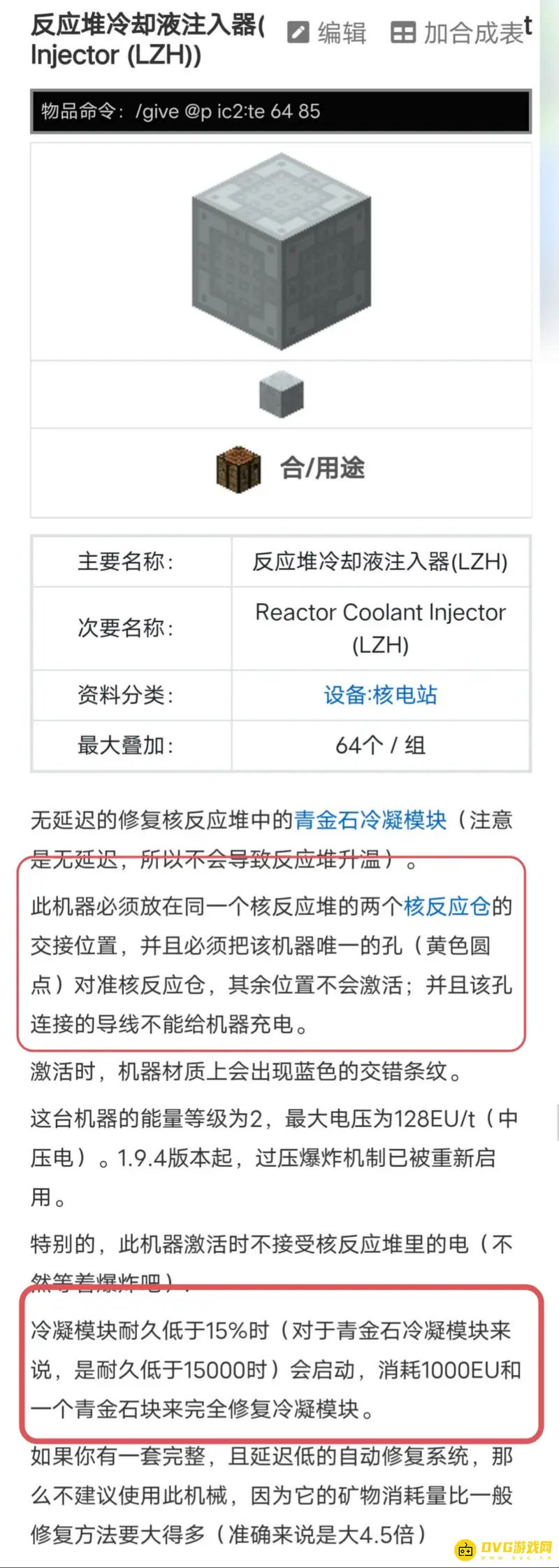 此机器必须放在同一个核反应堆的两个核反应仓的交接位置,并且必须把该机器唯一的孔(黄色圆点)对准核反应仓,冷凝模块耐久低于15%时(对于青金石冷凝模块来说,是耐久低于15000时)会启动,消耗1000EU和一个青金石块来完全修复冷凝模块。