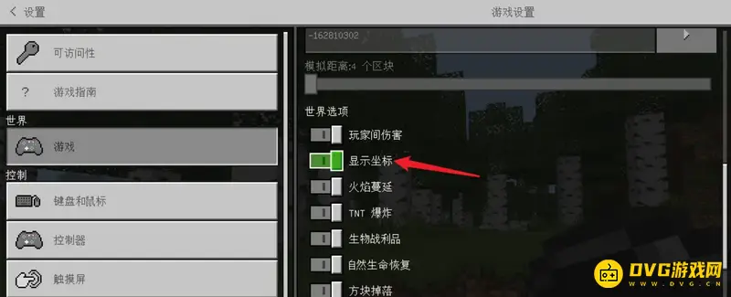 3、找到坐标选项,点击开启坐标功能,返回我的世界。
