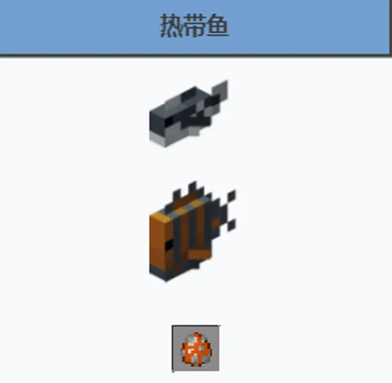 2.热带鱼在基岩版和原服务器版里被称作小丑鱼。小丑鱼能根据钓鱼得到的食材,服用后可以恢复1点挨饿度和0.2饱和度。它仅用以做为食材或收服豹猫,可是做为食材而言它比别的鱼更低效能,只有修复1精力。小丑鱼不可以被放进熔炉烹制,而且小丑鱼也相对难钓,有2%概率作为守卫者和远古守卫者的稀缺坠落物坠落。