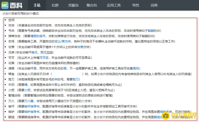 小女仆的作用为:主动攻击敌对生物、弓兵攻击、弹幕攻击、农场工作、破坏甘蔗及瓜类、种植可可豆、破坏花草、破坏雪、喂食主人、使用剪刀 、挤奶、插上火把、繁殖动物、灭火 、破坏方块、熔炉、酿造。