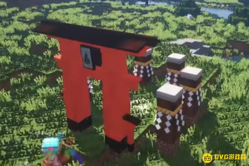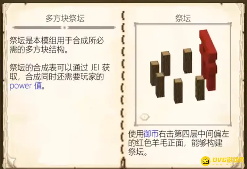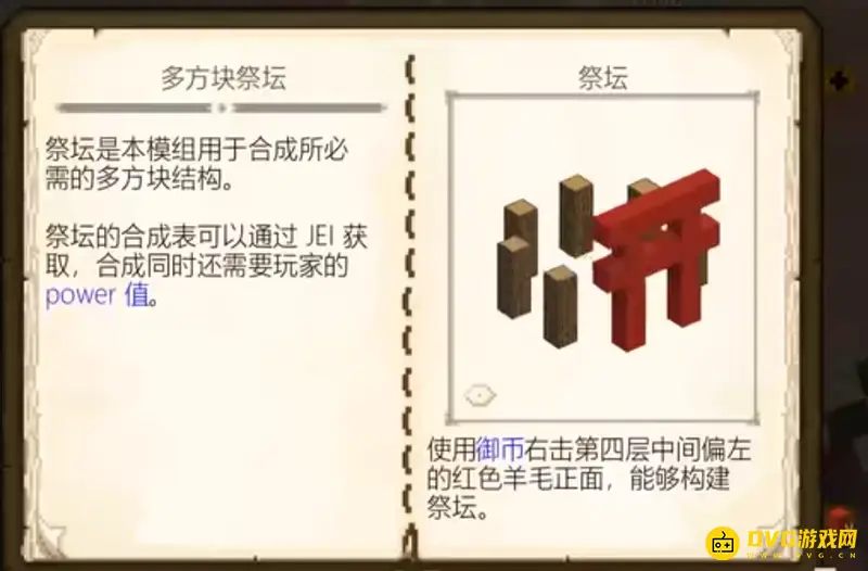2、根据说明搭建一个多方块祭坛,需要的材料是橡木和红色羊毛,这一步非常简单,根据模型搭就好。