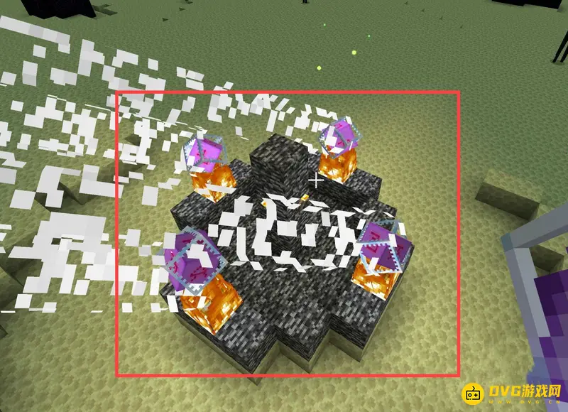 1、主要就是把四个末地水晶放在末地中的龙巢的前后左右方向(如下图所示),然后那四个末地水晶就会激活所有的黑曜石柱,随后末影龙便会重现天日。注:两个有铁笼的黑曜石柱上的铁笼也会被修复