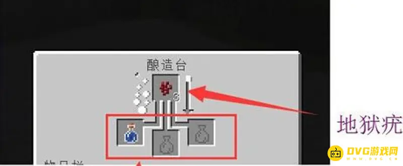 (1)在酿造台上的把水瓶放在下面三个各自的任意一个,然后最上方放上地狱疣,等几秒后制作出来的药水就是粗制药水啦。