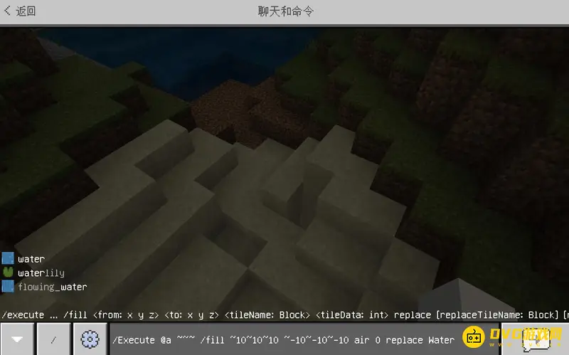 指令为/Execute@a~~~ /fill 坐标 坐标 air 0 replace Water。