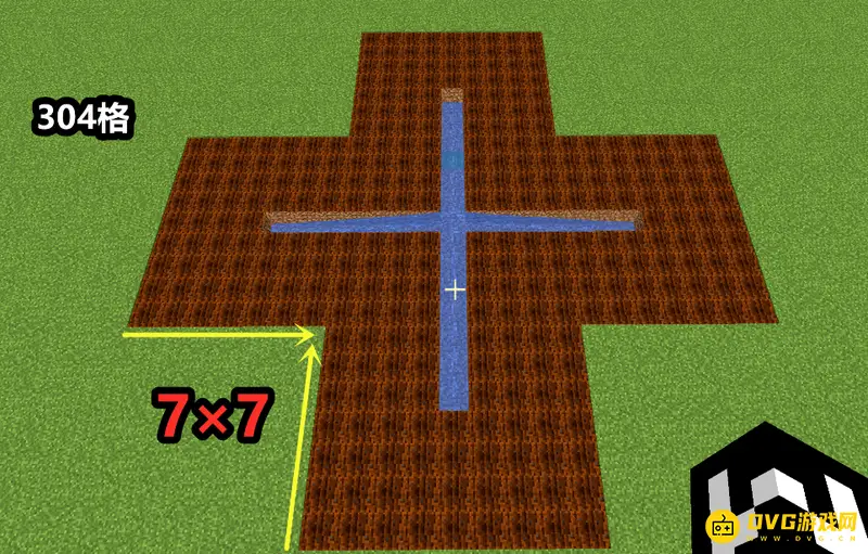 第三种情况为十字水流灌溉,能湿润304格土地。灌溉的农田的边长为15 8=23格,故湿润土地的面积是23*23-(14 14 1)-(7*7*4)=304格。