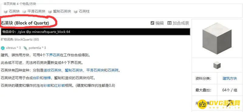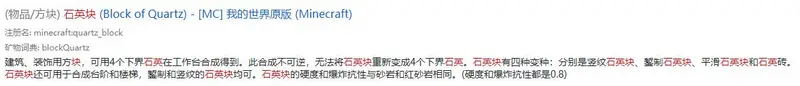 2,然后就可以在界面左上角发现,石英块的英文是Block of Quartz。