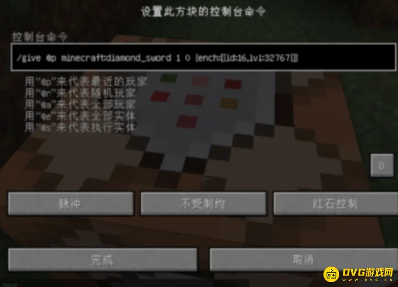 4、接着输入"/give @p minecraft:diamond_sword 1 0 {ench:[{id:16,lvl:100}]}"。