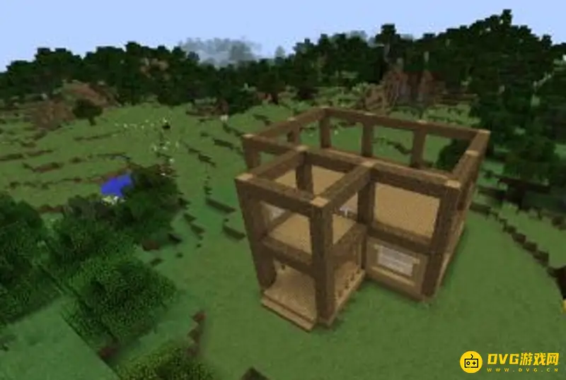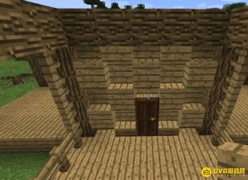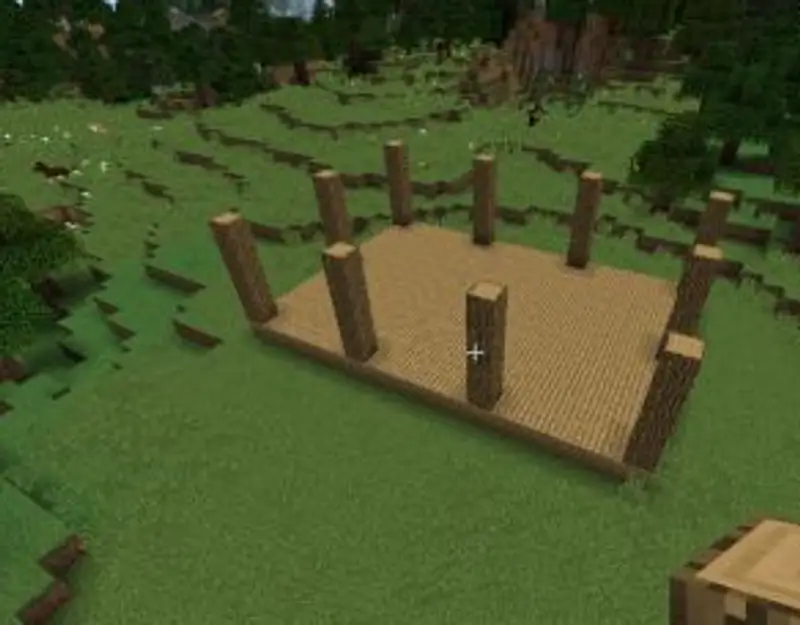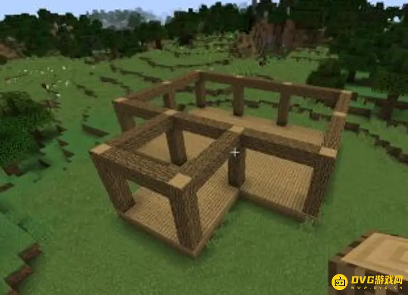 3、然后在这个位置搭一个7×6的门厅,在两个角上也搭上五格高的原木柱子,用10根横柱子把竖的柱子连起来。