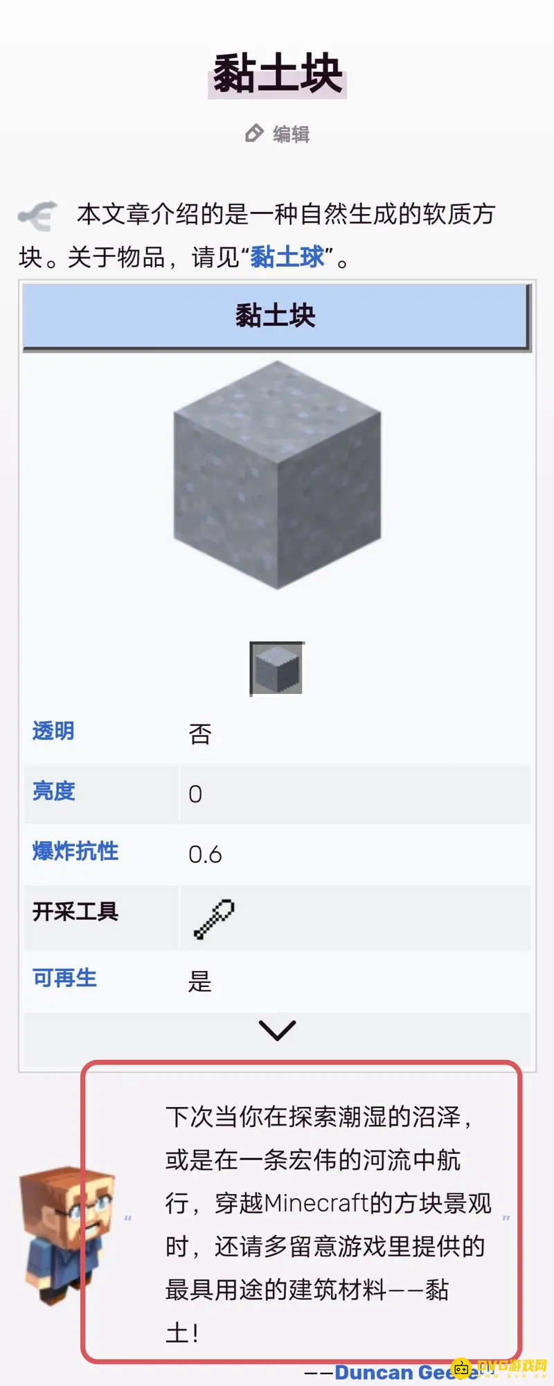 潮湿的沼泽或是河流中会有黏土。黏土块通常生成于河流、湖泊和沼泽的底部,以圆盘的形式存在。粘土块一般会在有水的地方附近,在海洋的深处会大量分布着粘土块,在一些较深湖泊的底下也会有粘土。
