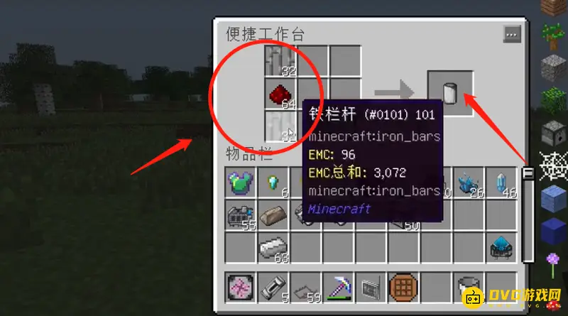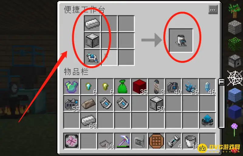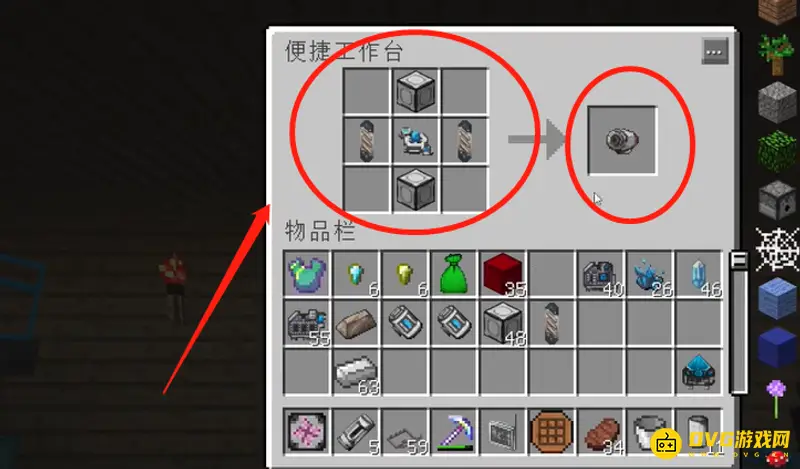 1.把铁、机械框架、能量转换器按图的顺序摆好,生成支架底座,将支架底座放到想放的空地上;
