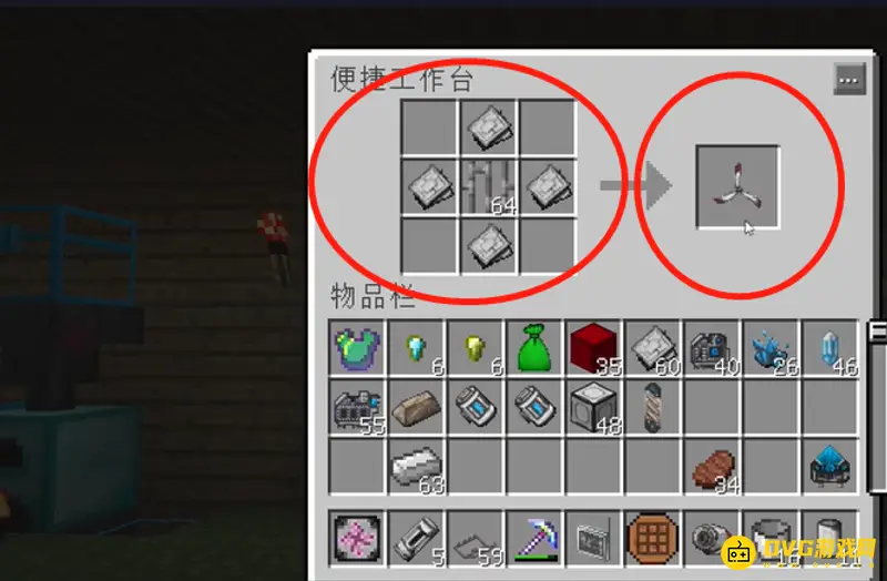 4.用铁板、铁栅栏按图顺序摆好,合成扇叶;(在主机上添加扇叶)