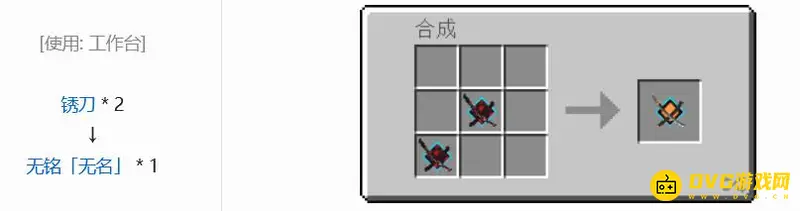 我的世界无铭是通过合成获得的,它合成的材料是两把锈刀,这两把锈刀这两把锈刀必须要是带刀鞘的,并且没有断的,这个可以在野外刷僵尸得到,然后直接在工作台处就可以合成了,又或者是用两把带有风字或者印字,又或者是妖字的刀在工作台处也可以合成无铭。