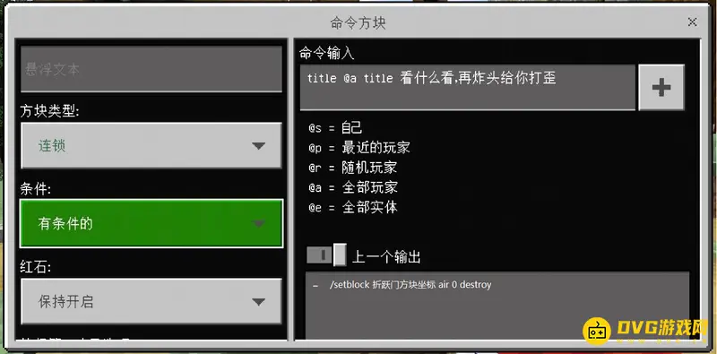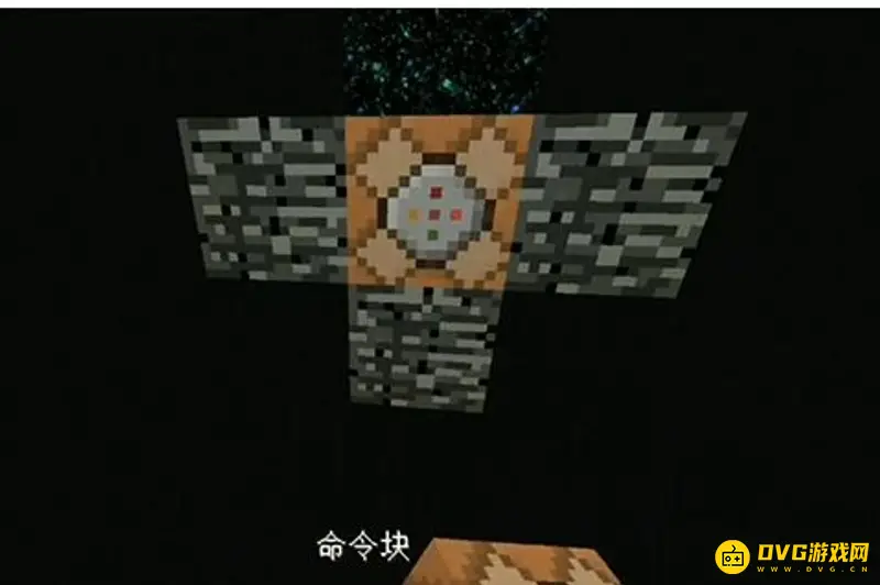 2.在折跃门方块上放一个命令方块,输入【/setblock 折跃门方块坐标 air 0 destroy】,激活命令方块就可以获得末地折跃门方块了。