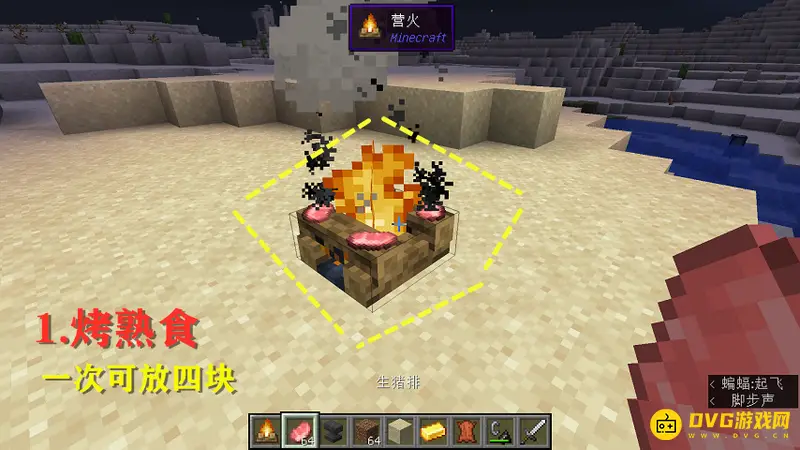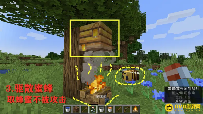 ③使用营火,玩家能够在不激怒蜜蜂的情况下采集蜜脾或蜂蜜瓶,而灵魂营火可驱离非战斗状态的猪灵。