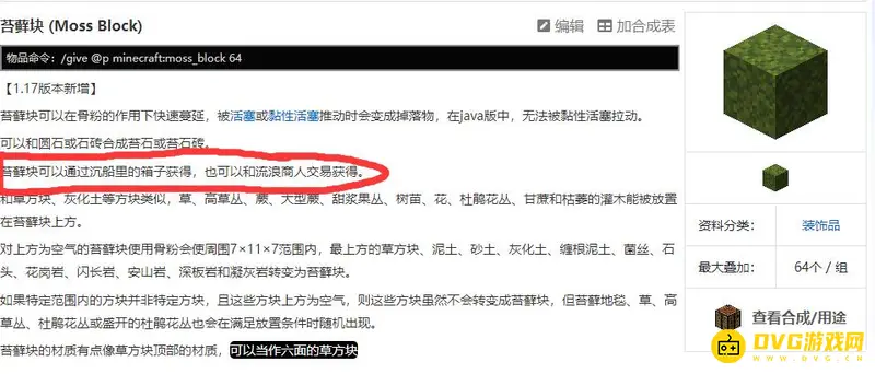 首先我们搜索并进入我的世界苔藓块的相关说明,然后就可以在界面中间发现苔藓块可以在沉船里的箱子获得,也可以和流浪商人交易获得。