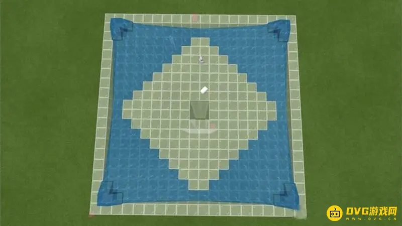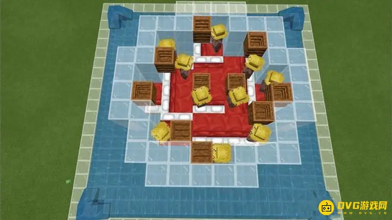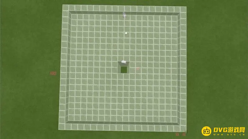 2、接着向外延伸9格,每边均为9格长(水流最远的距离是8格,最外一格做围墙),即制作成20×20的平台,中间空4个方块。然后将四周提高一格。