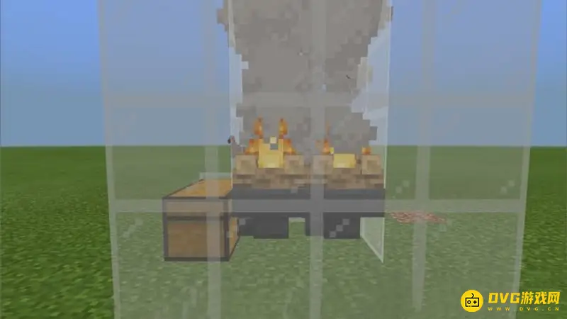 7、在地面放置一个大箱子,在通道中放上漏斗,漏斗的上面放上营火。注意漏斗的方向都要对着箱子,即可完成制造。