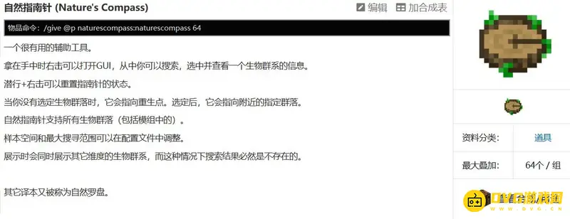 自然罗盘拿在手中时右击可以打开GUI,从中你可以搜索,选中并查看一个生物群系的信息。潜行 右击可以重置指南针的状态。当你没有选定生物群落时,它会指向重生点。选定后,它会指向附近的指定群落。