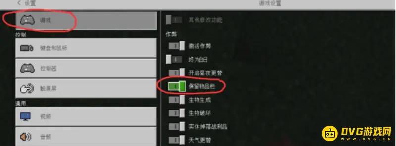 2.然后点击左侧游戏,把右侧的保留物品栏开启即可。