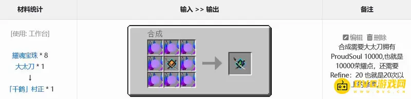 我的世界千鹤村正制作方法是使用8个耀魂宝珠和1个大太刀合成获得,这个进化条件对大太刀的要求是Refine≥20,proudsoul≥10000,把大太刀放在中间,8个耀魂宝珠分别放在大太刀的周围,就可以合成出一个千鹤村正了。耀魂宝珠是烧制燿魂铁锭得到的材料,是制作刀的高级材料。