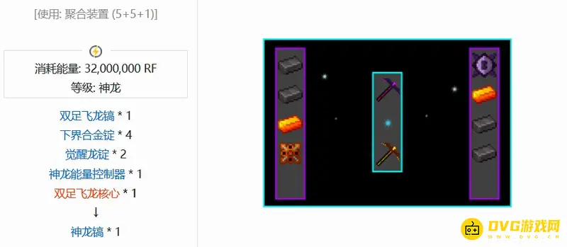 双足飞龙镐可以用升级核心在聚合装置中升级神龙镐,升级之后即可增加挖掘范围。玩家可以用1个觉醒核心、2个觉醒龙锭、1个双足飞龙镐、1个神龙能量核心在工作台进行合成。