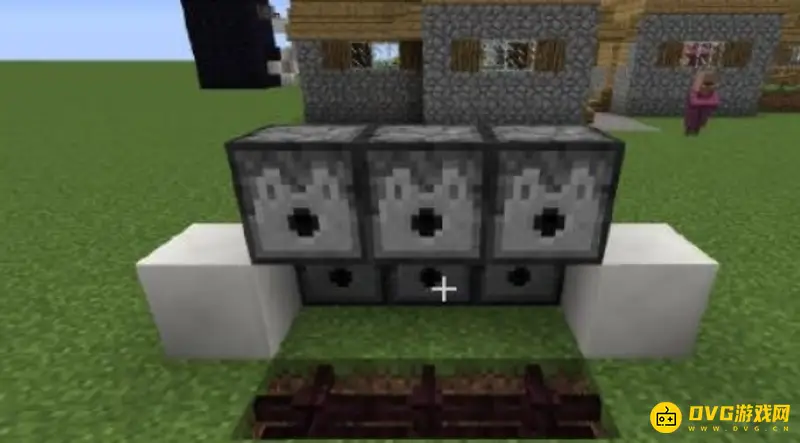 2、如图放好两行一前一后发射器,然后两旁放方块,前面三格挖空放任意一种栏杆。