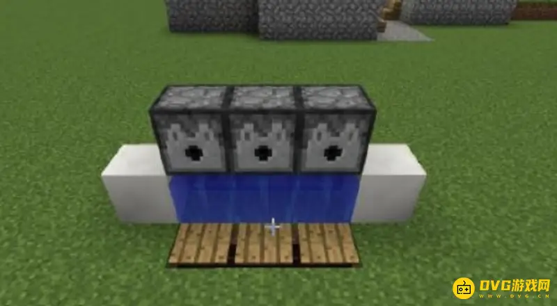 3、在第一行发射器前灌入三格水,然后在栏杆上放压力板。