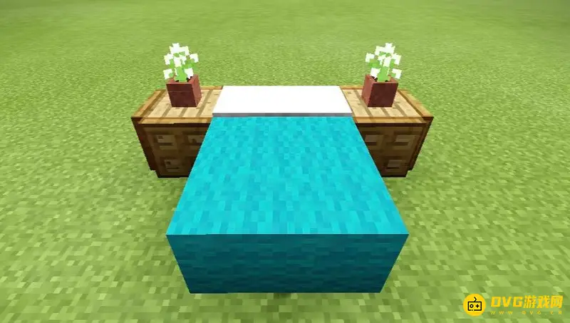 2、床。羊毛做床的主体,地毯做枕头,比原版床更具层次感。利用木制陷阱门修饰木板,最后再放上温馨的花盆,完美的床就做好了。