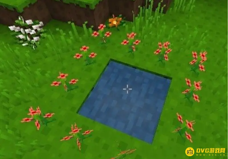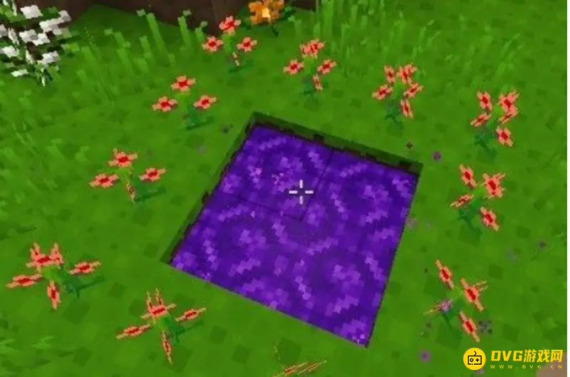 2.传送门的制作需要水,获得水需要水桶,还需要一些花,先需要在草地挖个正方形的坑,挖一格就可以,如图所示。