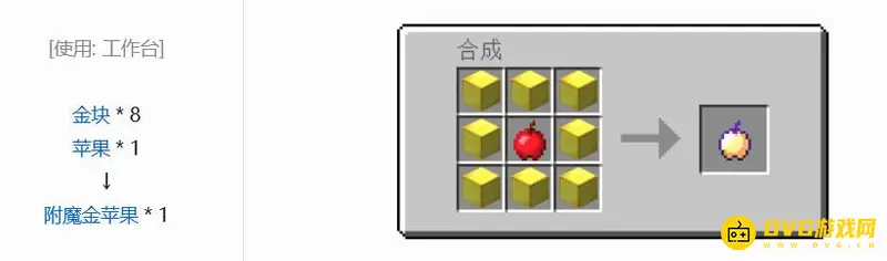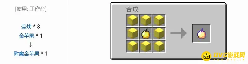 2.另一种方式同样是用8个金块和一个普通的金苹果在工作台处合成附魔金苹果。