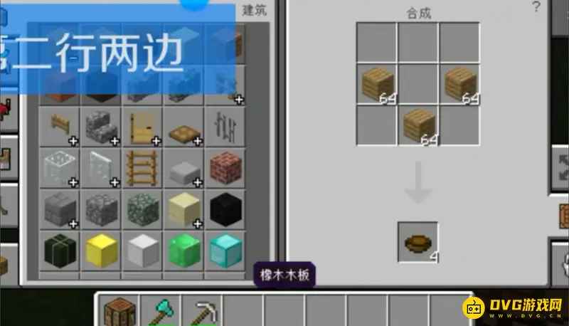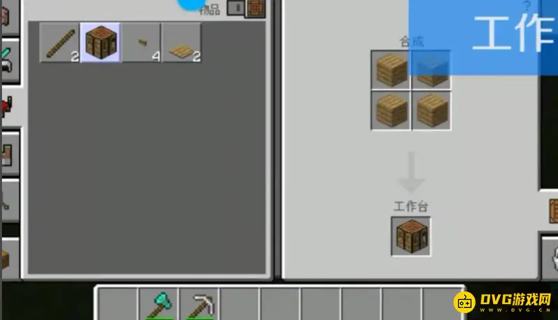 2、第二步:将获得的木头方块放置在工作台合成木板,每根木头可以合成四个木板