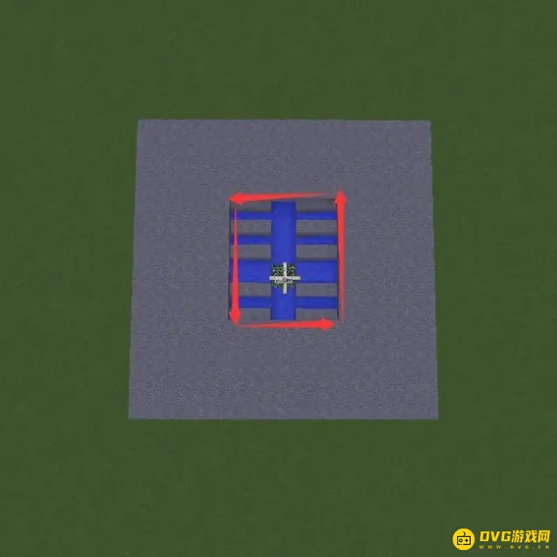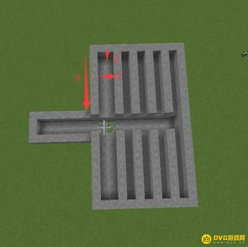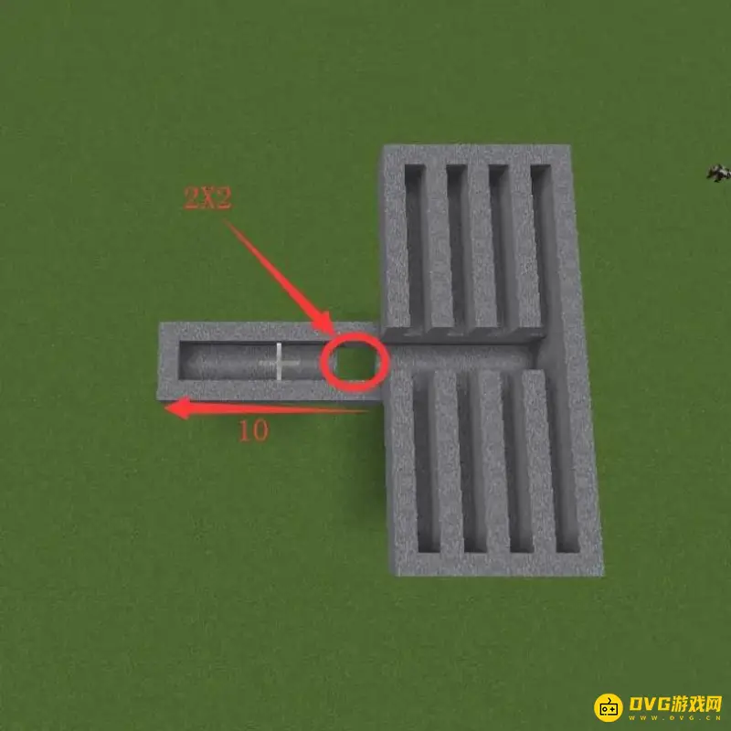 6、在横向的尽头空出一个2X2的区域,并且两边向外延伸10格围起来,中间区域为8格的距离。